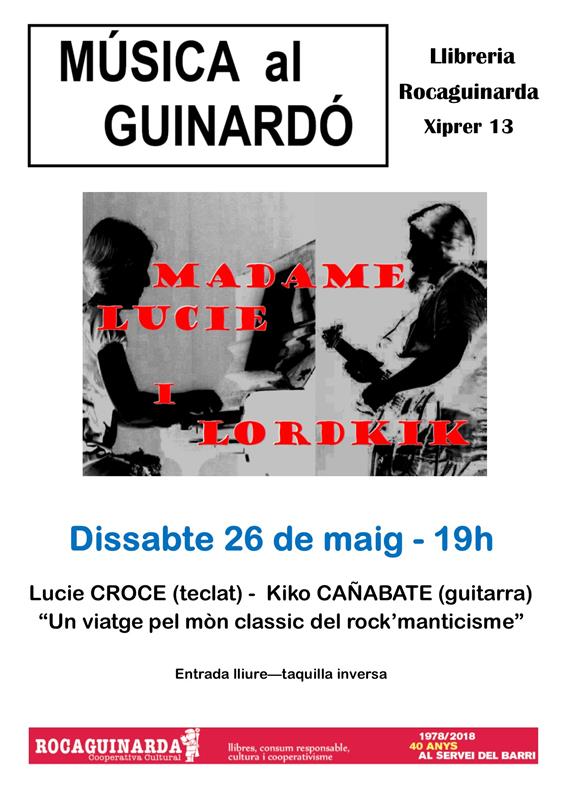 Dissabte 26 de maig, 19h, llibreria Rocaguinarda. Lucie Croce (teclat) i Kiko Cañabate (guitarra) ens porten a fer "un viatge pel mòn clàssic del rock'manticisme"