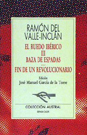En Baza de Espadas, última parte de la trilogía El Ruedo Ibérico y cuya acción se desarrolla en el verano de 1868, plantea don Ramón del Valle-Inclán el contraste entre la Reina de los tristes destinos y el movimiento revolucionario que significa la protesta de todo un pueblo que exige buenos ejemplos en las alturas. Frente a los terrores y liviandades de la Corte y sus camarillas se alza la figura de Salvochea, un santo laico, de los santos que canoniza el pueblo soberano. A lo largo de la obra se van combinando datos históricos e imaginarios. En todo brilla el arte de Valle-Inclán, que pone en pie sobre la escena un cuadro de enorme plasticidad en el que pululan personajes deformes y esperpénticos. José Manuel García de la Torre, especialista en la trilogía, ofrece en esta edición todas las claves históricas de la obra, a la vez que analiza su gran riqueza lingüística y literaria. Este volumen incluye, además, Fin de un revolucionario, obra inacabada pero conexa con El Ruedo Ibérico.