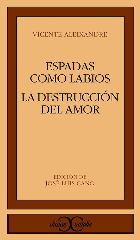 ESPADAS COMO LABIOS, tercer libro de Aleixandre, aúna en sus páginas los temas eternos de la poesía: la vida, el amor, la muerte. No se trata de poesía pura, fría, aséptica, sino de poesía cálidamente humana. LA DESTRUCCIÓN O EL AMOR es no sólo el libro que reveló la poderosa personalidad de Vicente Aleixandre como poeta, al tiempo que le situó entre los de mayor fuerza y originalidad, sino que es una de sus obras más fértiles y que más influencia ha ejercido en poetas de las generaciones posteriores.