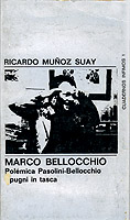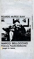 El lector tendría derecho a pedir que el libro le sirviera de introducción al mundo de Marco Bellocchio, pero nosotros tenemos el deber de advertirle que no será así porque el libro ha sido concebido, mejor manipulado, por Ricardo Muñoz Suay, ese hombre que siempre está detrás impulsando en las sombras todas las oleadas de joven cine español, alguna resaca del viejo cine español —Viridiana, por ejemplo— y escribiendo sus columnas en revistas off y hasta en las revistas en. Si R. M. S. —habrán observado que estos individuos prefieren firmarse con iniciales— ha seleccionado textos y compuesto las notas de introducción pueden estar seguros que no será para facilitar la asimilación de Bellocchio. El lector está advertido : los papeles que anteceden probablemente están presididos por la misma intención traumática que las imágenes de I pugni in tasca.
